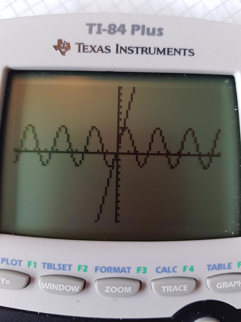 Lägg även in y = 6x + 1 och zooma in området runt x = 0.