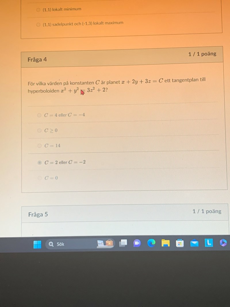 Så man får ekvationen (2x, 2y, -6z) = λ(1, 2, 3). Lös ut x, y, z i termer av λ och sätt in i ekvationen för hyperboloiden.