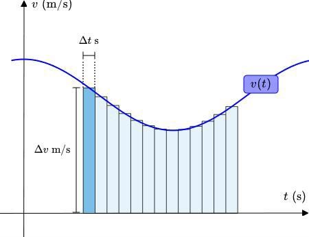 Från detta får vi då att sträckan man rör sig över ett litet tidssteg blir .Om vi nu räknar ut hastigheten i några punkter, säg i mitten av varje stapel i figuren (kopierade den från tidigare) kan vi för varje stapel skriva medelhastigheten som: