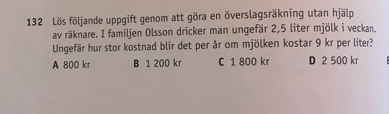 Jag har räknat ut att familjen dricker för ca 22,5 kronor i veckan. Men jag förstår inte hur man ska räkna ut? Överslagsräkning så förenklar, men ska man ta 52*20 så blir det 1040 ? Hur tänker man ? Enligt facit är det B.