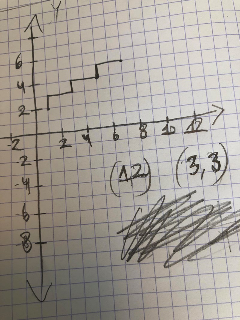 Sedan råkade du skriva fel "för varje 1 steg åt höger i x-axeln ritade jag ett steg uppåt för y-axeln"