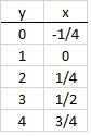I den ser vi att för varje ökning av y med 1 ökar x med 1/4 och att vi skär x-axeln i - 1/4.