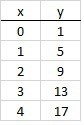 I formeln så ser vi genast att y ökar med 4 för varje ökning av x med 1. En tabell visar det tydligt.
