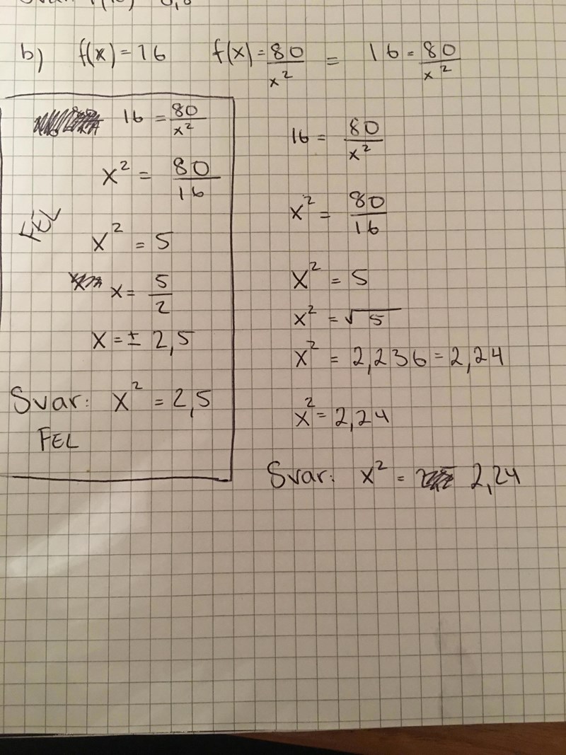 Jag tror att det bättre visar hur du tänker om du skriver en pil mellan f(x) = 80/x^2 och 16 = 80/x^2.