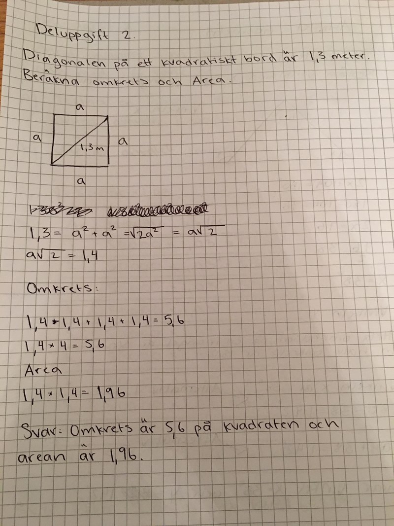 Jag ångrar mig. Du räknade rätt men glömde nog skriva ett rottecken över dina första a^2. Men du verkar inte ha gjort klart. Vad fick du 1,4 ifrån? För du har skrivit 1,3 ... = a*rot(2) som är rätt, och sen trollat fram den. Hur kan du lösa ut a?