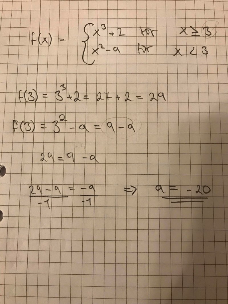 Såhär löste jag uppgiften ^^^^^ och tänkte bara fråga om jag tänkte rätt? Det är ju två polynom och för att de ska vara sammanhängande tänkte jag att tredjegradspolynomet måste ha om jag stoppar in 3 så måste det ha samma y-värde som andragradspolynomet. Och sedan likställer jag dem. Kan man alltid tänka så om nu är fallet att jag har rätt?