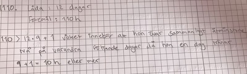 En musiker övar 110h under en period på 12 dagar. Visa att hon övar sammanlagt åtminstone 19h under två på varandra följande dagar. (Hon övar i hela timmar)