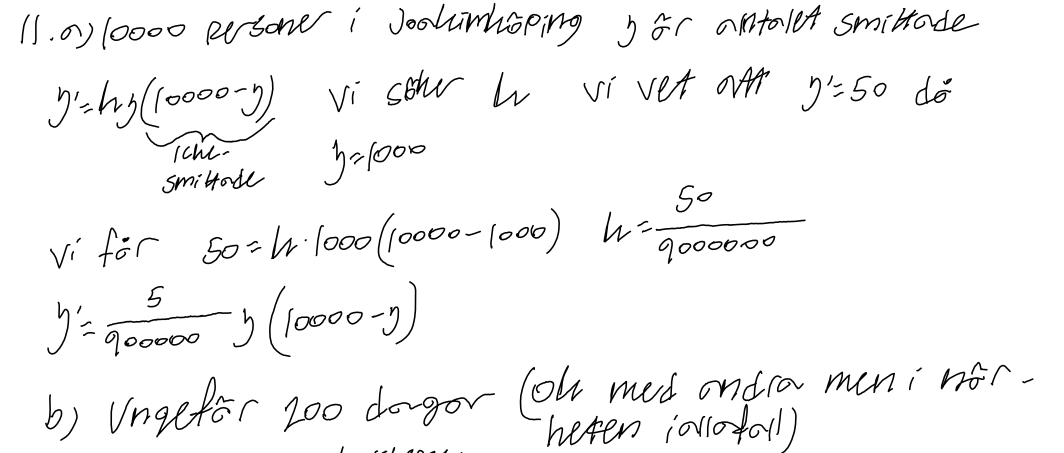 Totala befolkningen är 10000 och antal friska = 10000 − y. Smitthastigheten är proportionell mot produkten av smittade och friska. Alltså: y’ = k * y * (10000 − y). Nu bestämmer vi k. Vi vet att smitthastigheten är 50 personer per dag när y = 1000. Då gäller: 50 = k * 1000 * (10000 − 1000) 50 = k * 1000 * 9000. 50 = k * 9 000 000. k = 1 / 180 000