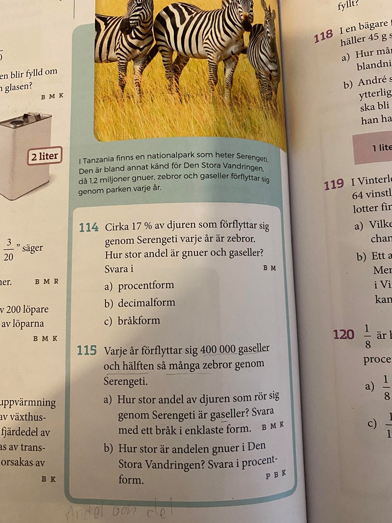 Om du inte tänker i procent för ett ögonblick utan i antal djur istället. Då står det i bildtexten att det totala antalet djur som förflyttar sig är 1,2 miljoner. Du vet också att det är 400 000 gaseller (och hälften så många av det zebror). Då kan du räkna ut hur många zebror och gnuer det är.