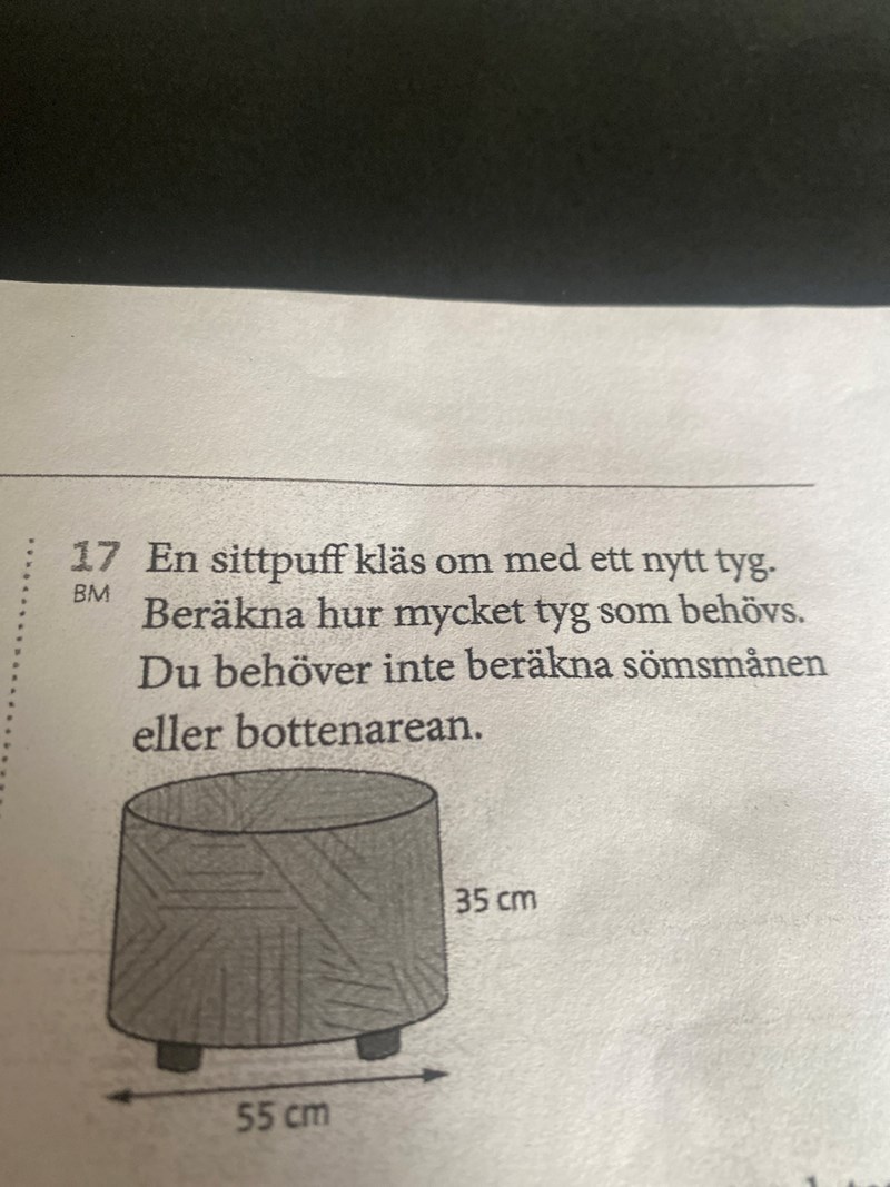 Men om mantel arean är 55 cm bredd den åker ju runt cirkeln då blir ju cirkelns omkrets 55 cm oxå