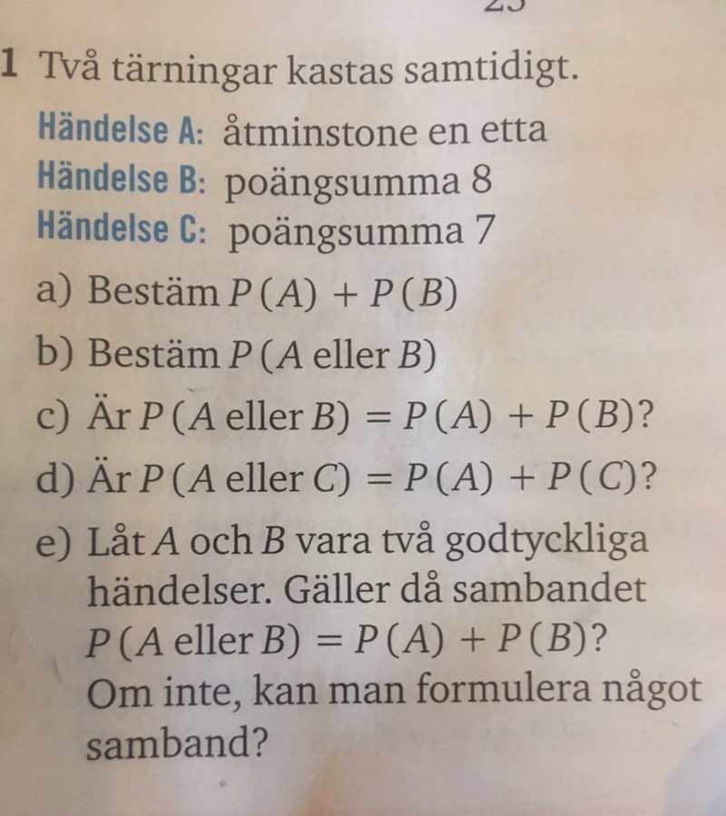 Bubo skrev:De A och B man pratar om i sista deluppgiften är vilka händelser som helst. Det hade varit tydligare att de den frågan som en egen uppgift. Den har ingenting med tärningarna att göra.