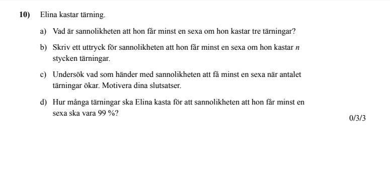 Börja med a): Hur stor är sannolikheten att få en trea om Elina kastar en tärning?