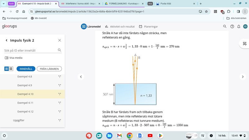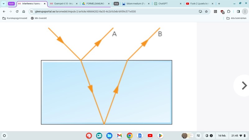 Hej, jag fattar att ljusstråle A färdas från luft som har n=1 till såphinna som har n=1,33 och sen reflekteras till luft med n=1