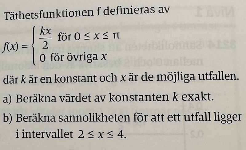Jag integrerade täthetsfunktionen från 0 till pi och satte lika med 1 för det gäller endast i det intervallet och då måste den totala arean vara 1.