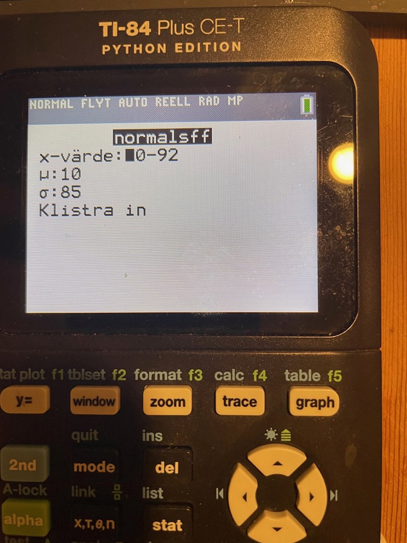 Tack för svar. Men vad menar du nu? I uppgiften står ju täthetsfunktionen för normalfördelning och frågeställningen är hur jag matar in den i den här räknaren. Uppgiften har jag löst i annat digitalt verktyg så det är enbart en fråga om HUR jag ska mata in i just denna räknare. Kan du hjälpa till?