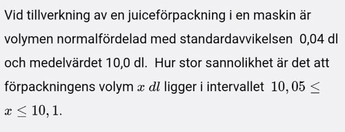 Det sökta är här P[10,05 < X ≤ 10,1] om X ~ N(10,0; 0,04)