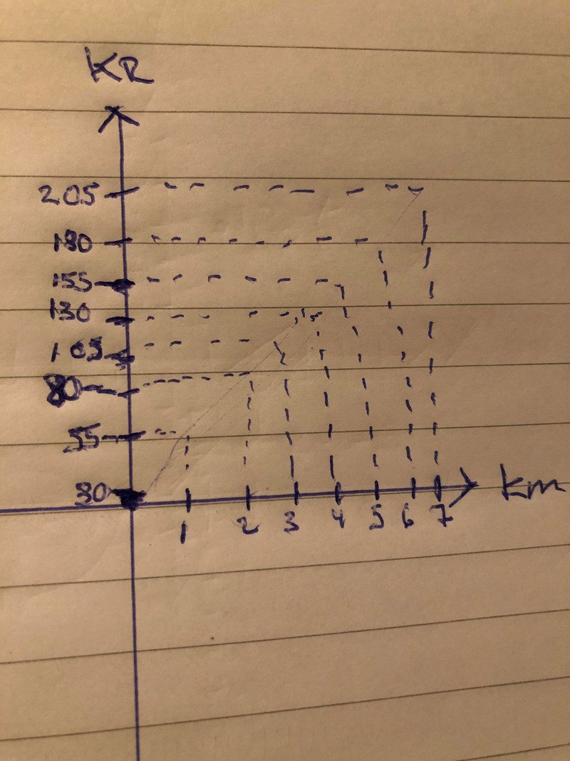 B: När man ska rita en graf är det alltid passande att rita en värdetabell. Gör två kolumner ett för pris respektive sträcka. Börja gärna från 0 km, det blir intressant då eftersom man redan då kan dra slutsatsen ifall det är en proportionalitet eller inte. Rita in antalet värden (välj själv hur många, det behöver inte nödvändigtvis vara många). Rita sidan ett koordinatsystem (hör av dig om du sedan härefter behöver mer hjälp).