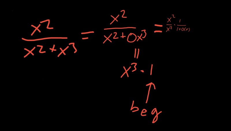 Vad står det stora O:et för? Jag vet att det heter stora ortodonationen och har för mig att det typ är ett annat sätt att skriva resttermen på (rätta mig om jag har fel). Hur har dem dessutom tänkt i uppgiften? Jag vet att det är menat att taylorutveckla nämnare och täljare men följer inte med i tankegången.