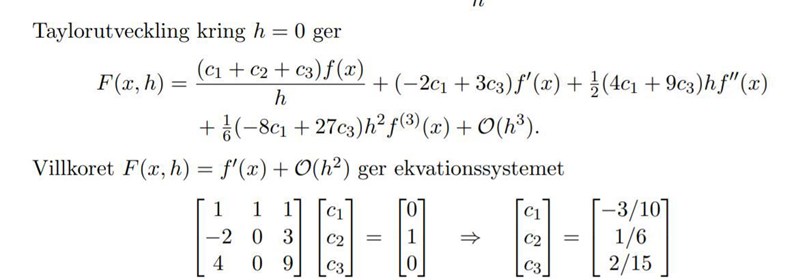 Det är lite oklart vad det frågas efter, men [0 1 0] kommer från "Villkoret F(x,h) = f'(x) + O(h2)", som ger villkor på c1, c2 och c3.