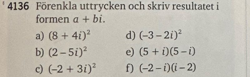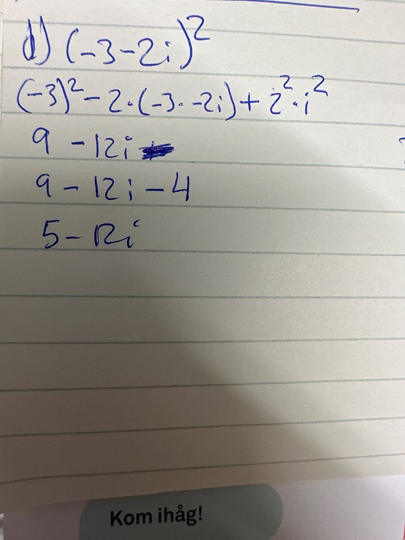 Jo, men då borde du använda (a+b)2=a2+2ab+b2=(-3)2+2*(-3)*(-2i)+(-2i)2(a+b)^2=a^2+2ab+b^2=(-3)^2+2*(-3)*(-2i)+(-2i)^2. Det beror på vad man tycker är lättast.