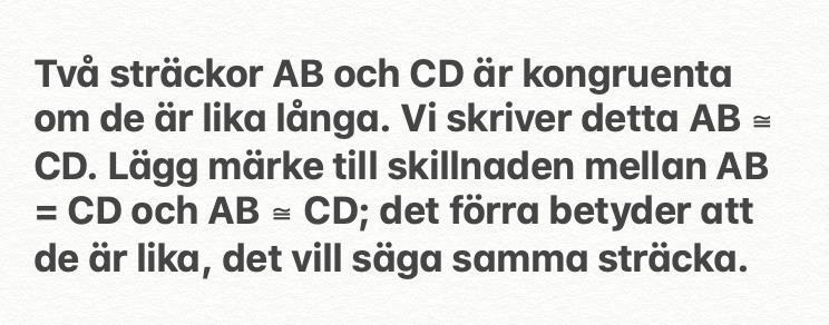 Laguna skrev:Jag kommer inte på när två sträckor skulle ha samma längd men inte vara kongruenta, så jag förstår inte poängen med deras distinktion.