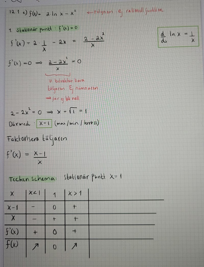 Jag har fått ut att x=1 då f'(x)=0, så x=1 kan jag ha i mitt schema. Men finns det något annat x-värde som är värt att ta med i schemat?