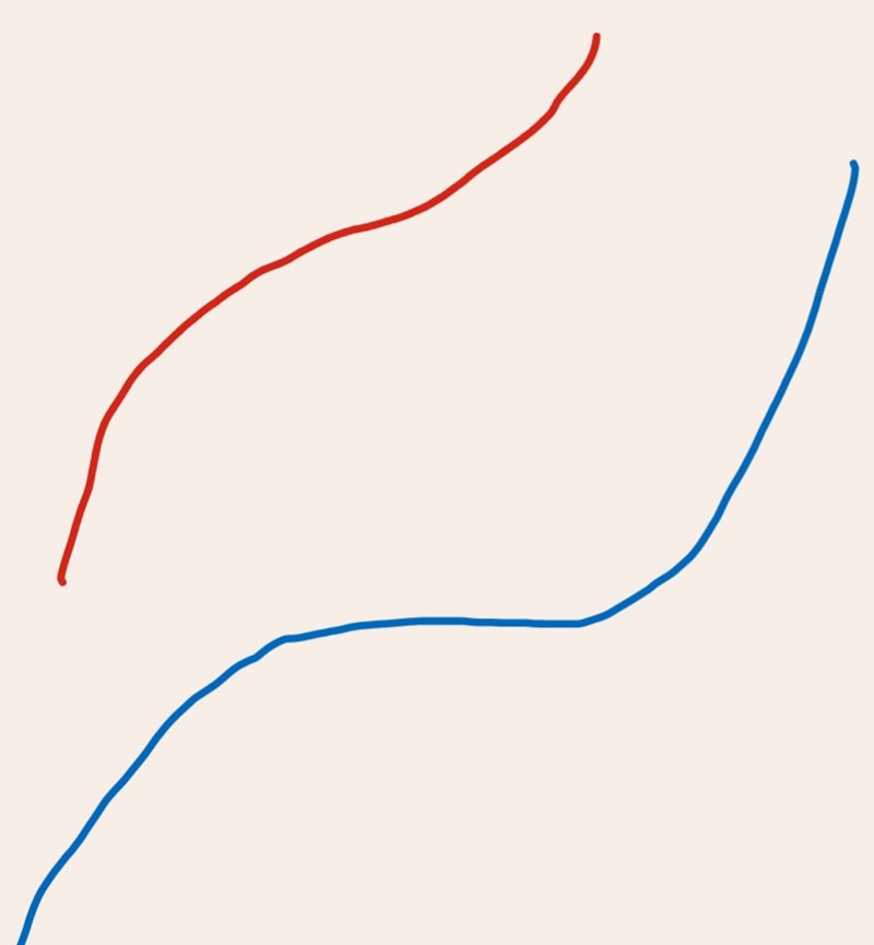 Men den ska inte se ut så. Den där ska se ut som den blåa kurvan. Grafen ska vara horisontell (ha lutning 0) vid origo.