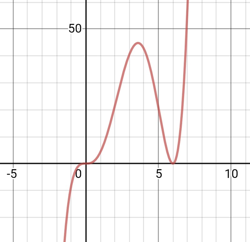 Du har funktionen V(x) = (x3/3)(6-x)2 = (x5/3)-4x4+12x3. Det första skrivsättet visar att x = 0 är en rot, och att x = 6 är en dubbelrot. Det andra skrivsättet visar att kurvan i stort sett lutar så här: /
