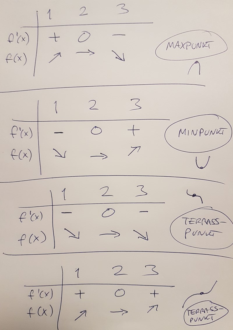 Jag är med nu på vad du menar. Nu tror jag att det börjar smälta. Om man beräknar derivatans nollställen för funktionen då kommer man att få fram maximi,minimi eller terasspunkter för där är derivatan 0. Med hjälp av en tecken tabell kan man sedan konstatera huruvida de beräknade x värden är en maximi,minimi eller en terasspunkt.