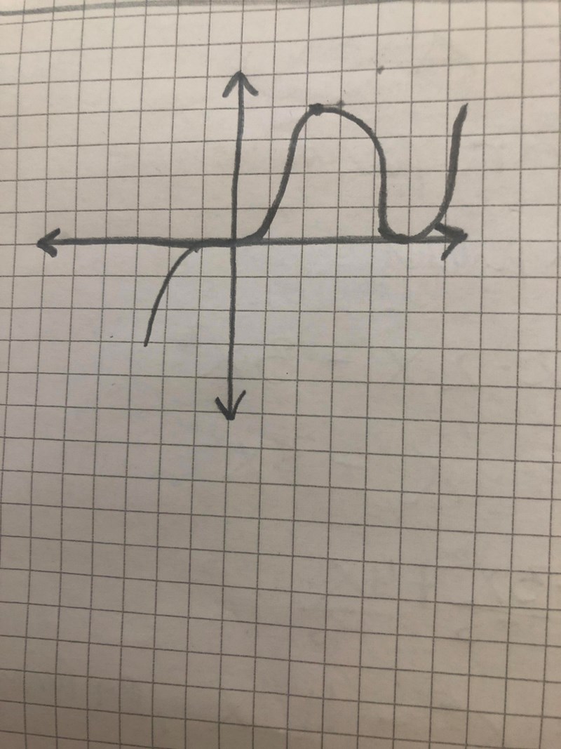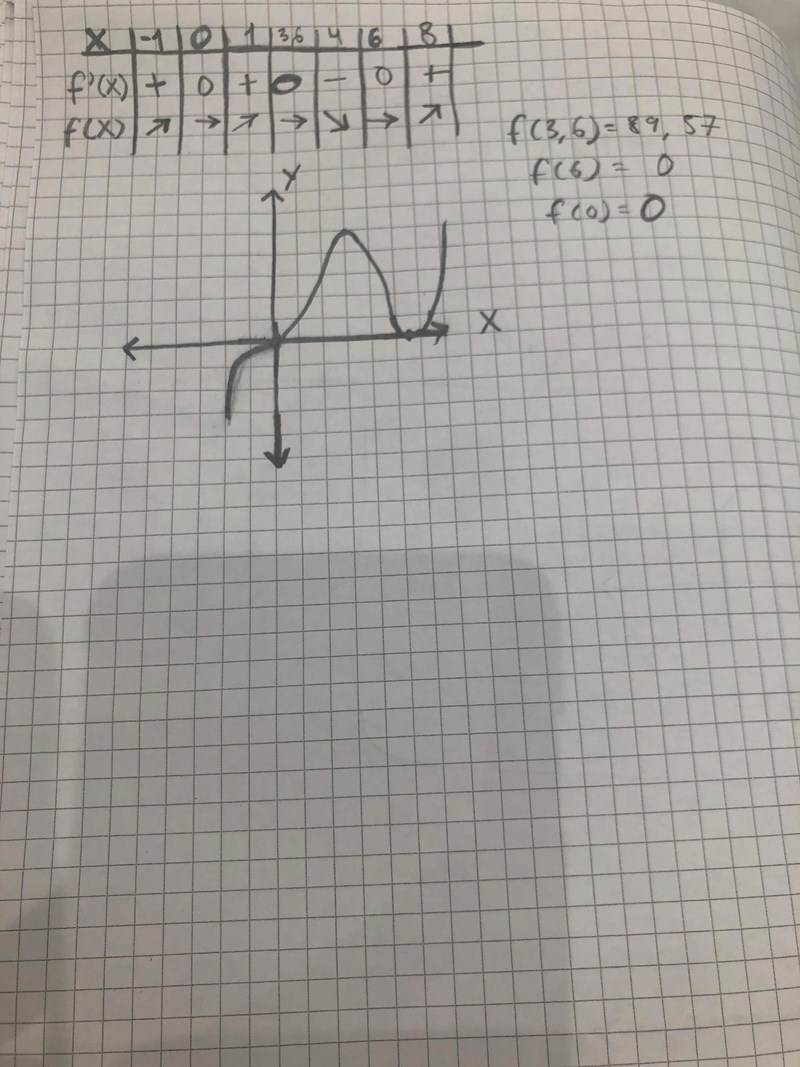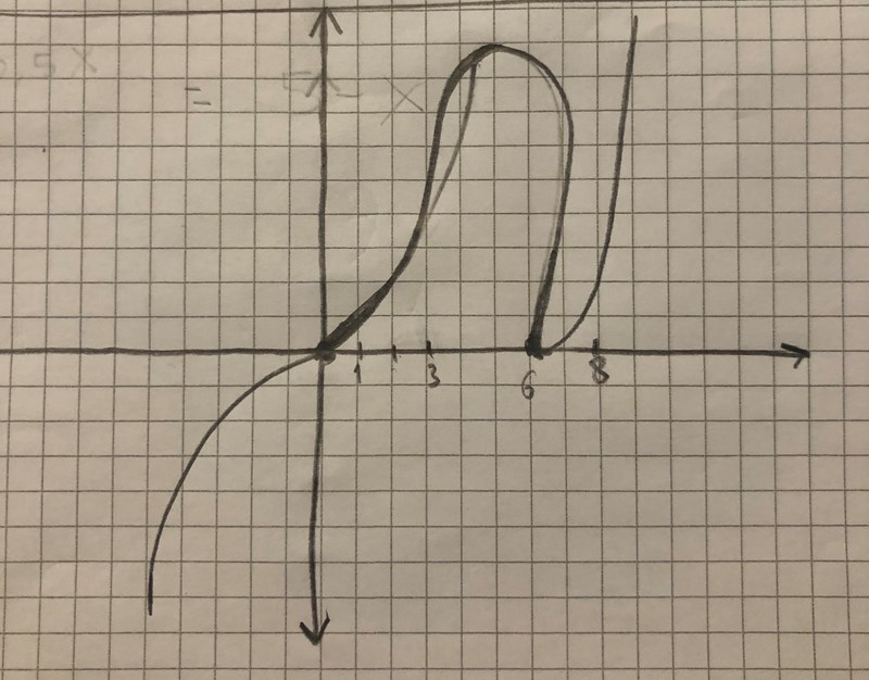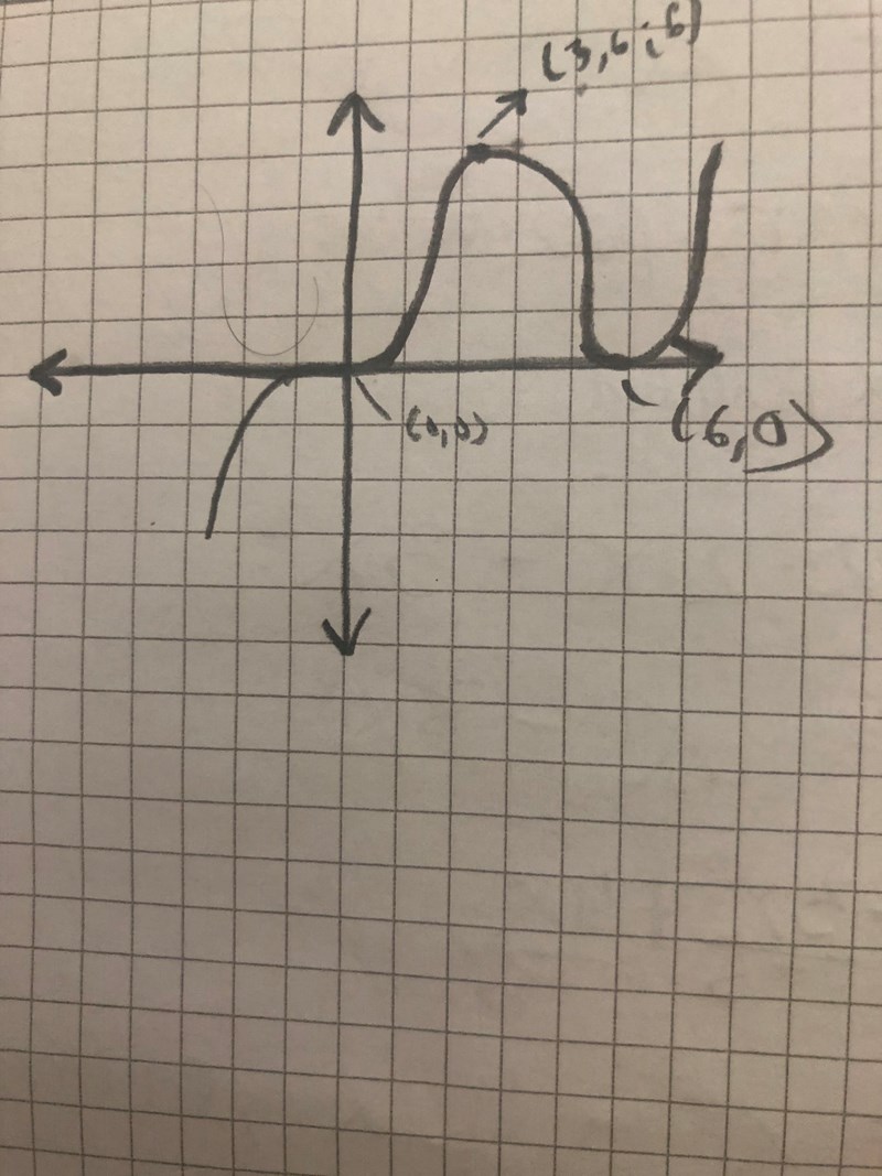 Det som skulle kunna förbättras är att du sätter ut koordinater vid kända punkter, att det tydligt framgår att grafen har en terrasspunkt i origo och att grafen inte "böjer sig bakåt" mellan x = 3,6 och x = 6.