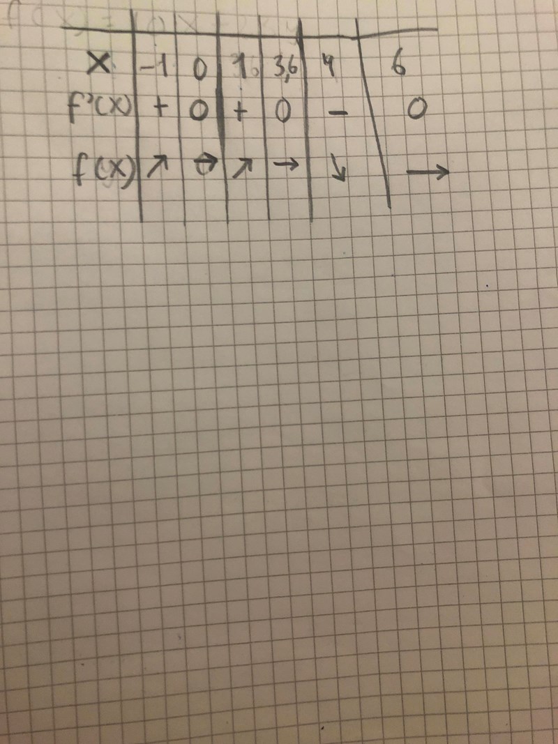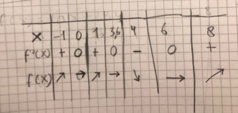 Ja nu är derivatans nollställen och teckentabellen rätt, men jag saknar ett x-värde som är större än 6 i tabellen, dvs hur ser derivatan ut till höger om x = 6?