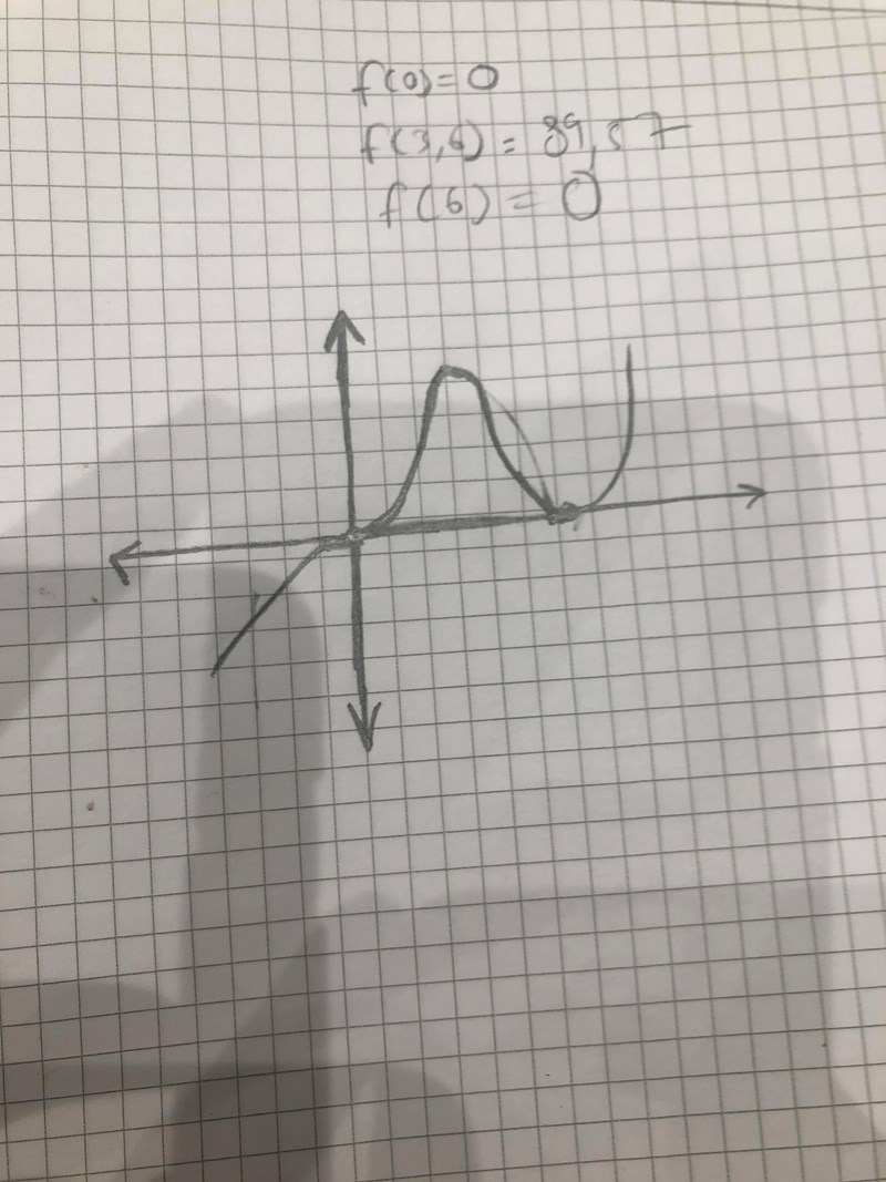 så derivata har en dubbelrot för x = 0 och rötterna x = 3,6 och x = 6. Vi vet ju redan att f(0) = f(6) = 0 så det enda funktionsvärde vi behöver beräkna är f(3,6) = 279936/3125 (= 89,57952). Pricka in dessa 3 punkter i ett koordinatsystem och rita en mjuk linje som passerar genom allihop.