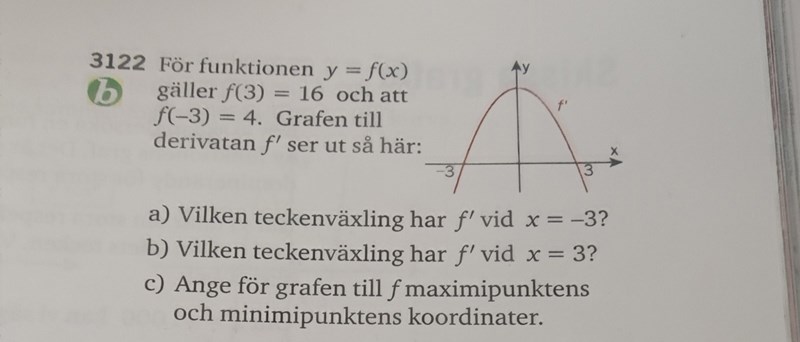men med teckenväxlingen menar de alltså +/- 0 +/- , eller? (alltså att man kollar tecknen ( +/-) innan derivatan blev 0?Jag vet inte vilken teckenväxling de menar utan att se själva frågan. Kan du ladda upp en bild på den?