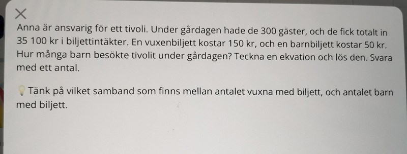 Om antalet barnbiljetter var b så var antalet vuxenbiljetter 300–b.