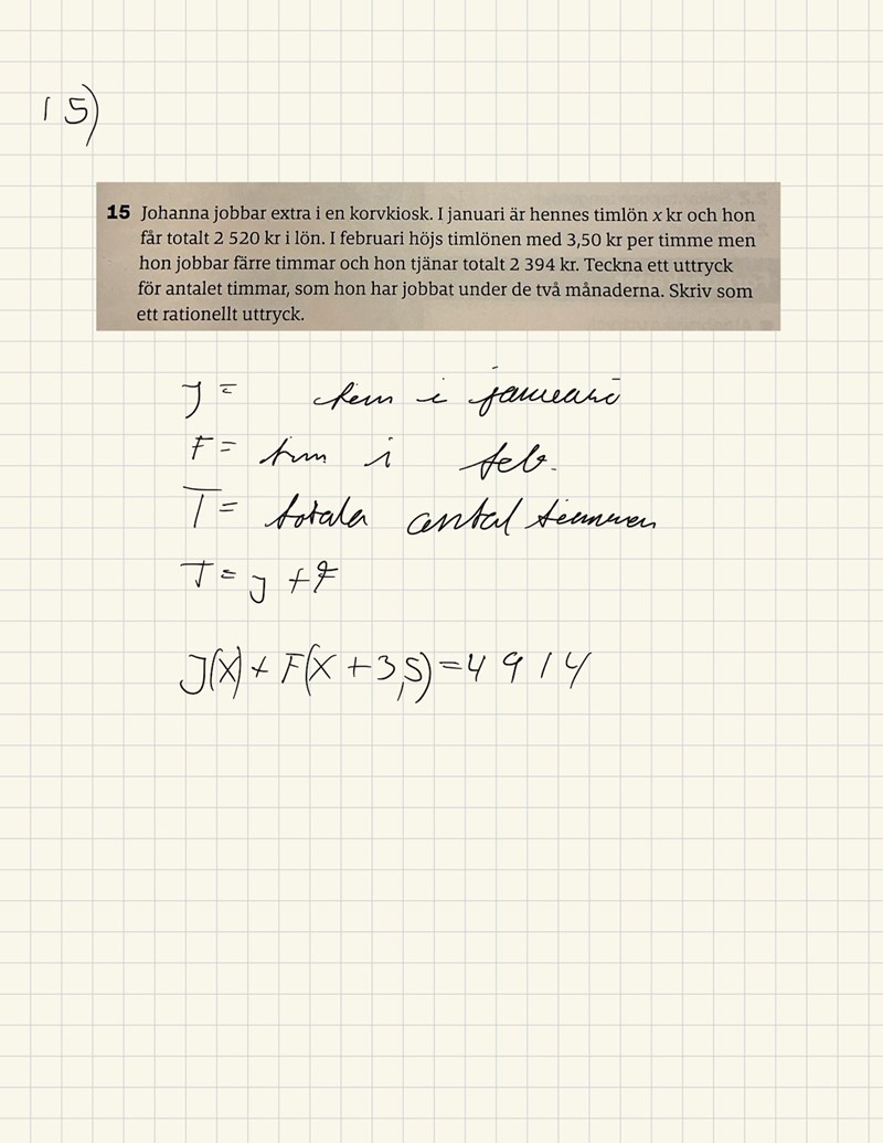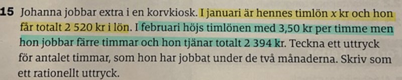 Om Johanna jobbar J timmar i januari med timlönen x kronor per timme så får Johanna ut J*x kronor i lön (dvs den totala lönen är antalet arbetade timmar multiplicerat med timlönen).