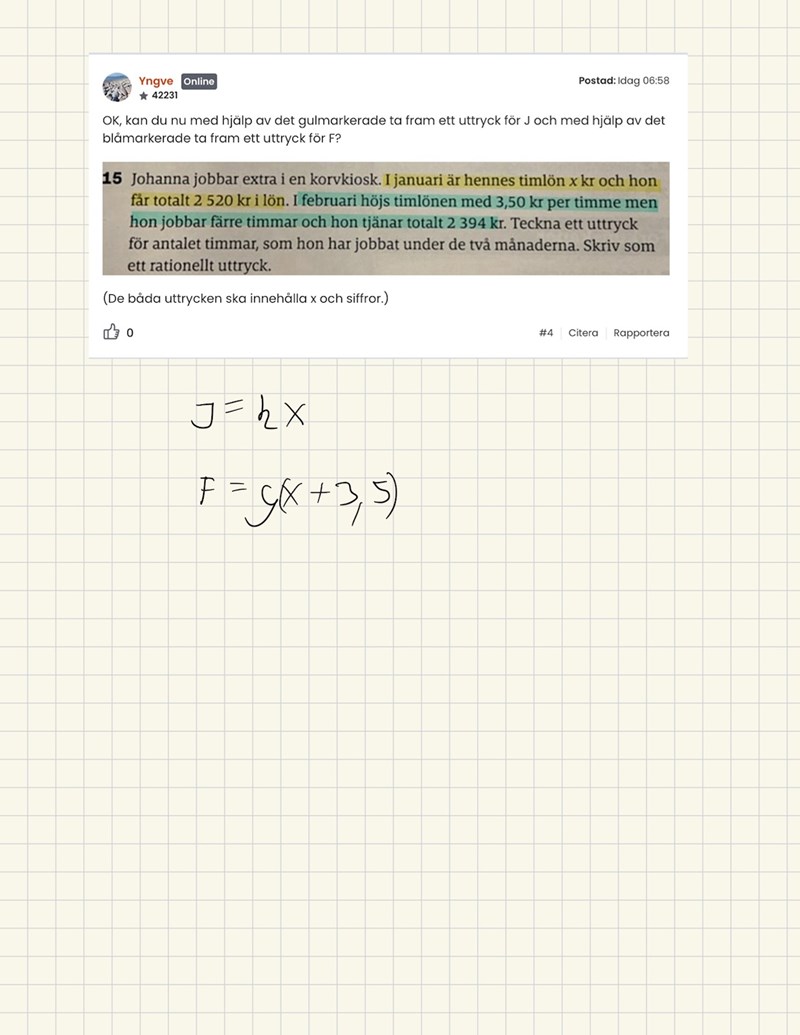 Du har alltså att J = 2520/x och att F = 2394/(x+3,5).