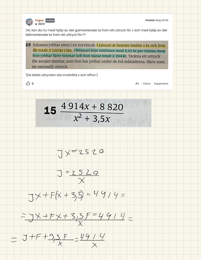 Wow, riktigt spännande uppgift. Förstod inte att man fick dela upp det i flera steg genom J + F sen, så lärorikt exempel.