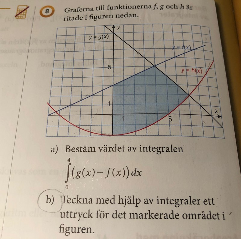Teckna ett uttryck för det markerade området i figuren m.h.a integraler