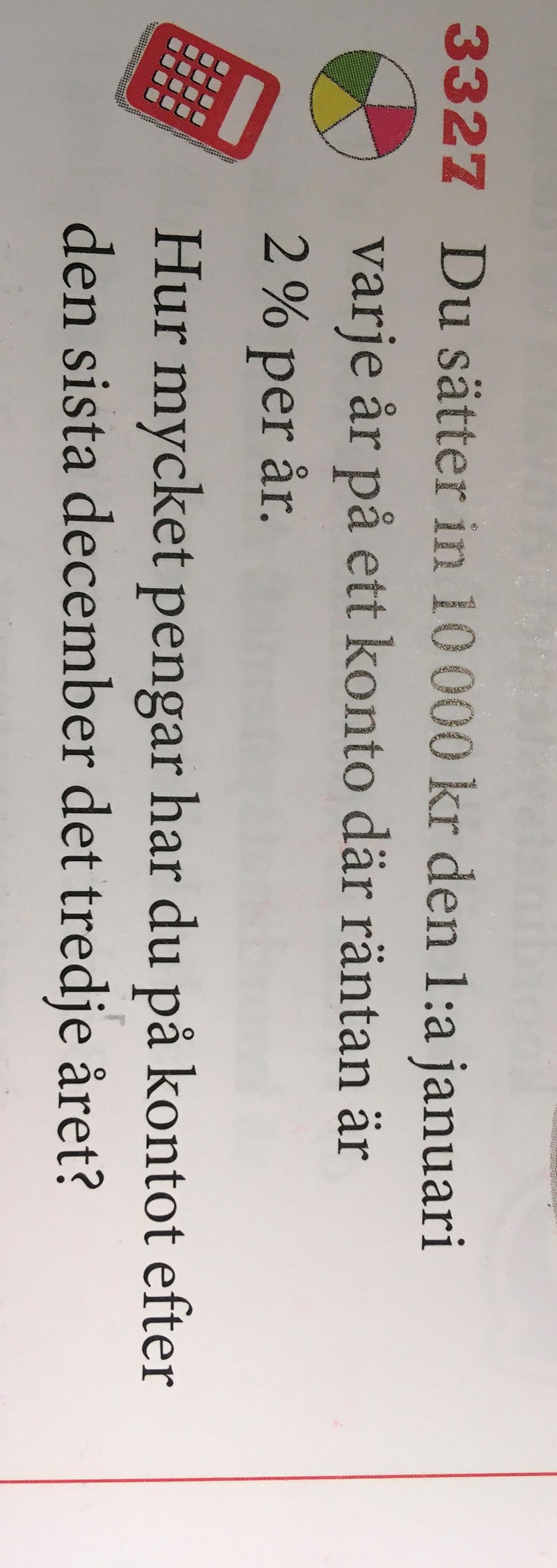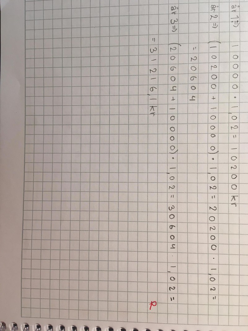 y= 10 000 * 1.02^x stämmer inte eftersom att det också sätts in 10 000 kr till för varje år som går, svaret ska bli 31216kr.