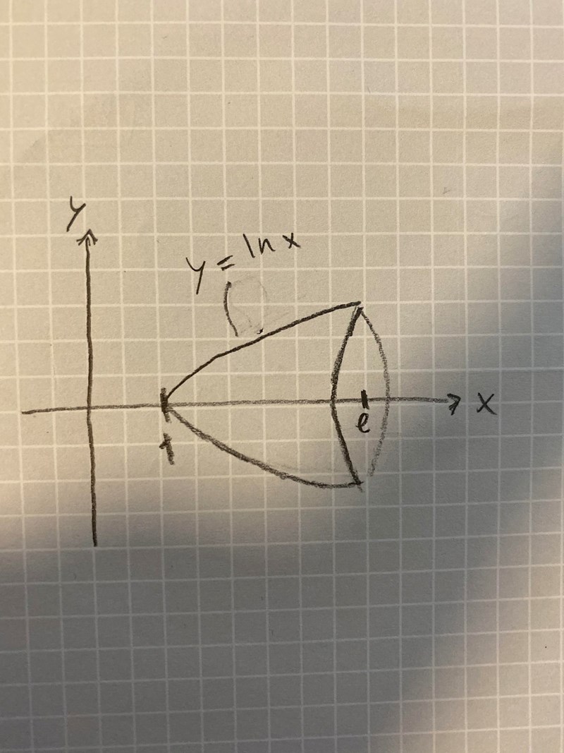 Området mellan kurvan y=ln(x), 1≤x≤e och x-axeln roteras ett varv kring x-axeln och jag försöker teckna en integral med integration med avseende på y men jag vet inte hur jag ska tänka för det känns väldigt onaturligt att uttrycka integralen i y. Om y=ln(x) så är x=e^y.