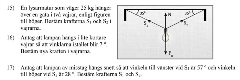 Jag har kommit fram till att det nog har med sinus att göra, och att S1 = S2. Tyngdkraften och normalkraften är även 245N, men mer än så har jag inte lyckats komma fram till. Svaret är S1 = S2 = 214N, men jag förstår inte hur man kommer dit. Kan någon hjälpa mig?