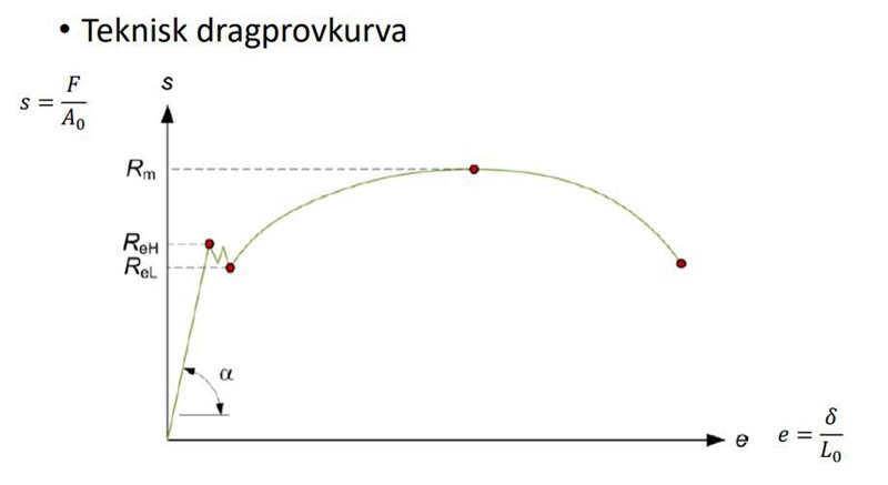 Antagandet för kurvan?... Det är den kurvan du får när du drar sönder en provstav i en dragprovsmaskin. Under själva dragprovet mäts sambandet mellan den ökade dragkraften (y-axeln) samt provstavens förlängning (x-axeln) tills det att staven går av. Där kraften vid själva brottet beror på materialets styrka samt provstavens tvärsnittsarea.