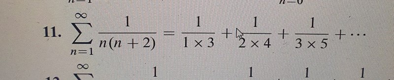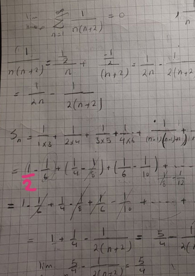 Varför min lösning är fel. Använde mig av partialbråks uppdelning och skrev om 1/ n(n+2) till 1/2n + 1/2(n+2) , men enligt facit det ska bli 1/2 ( 1/n - 1/ n+2)