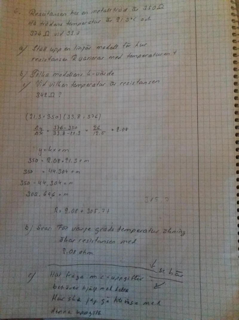 Du vet att resistansen följer sambandet R = 305,7 + 2,08 t. Du vill ta reda på vilket t-värde som ger R = 342. Det kan du lösa - det har du gjort tidigare.