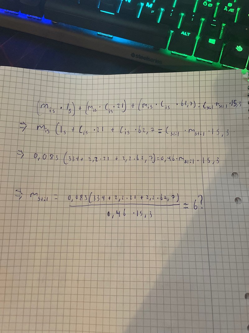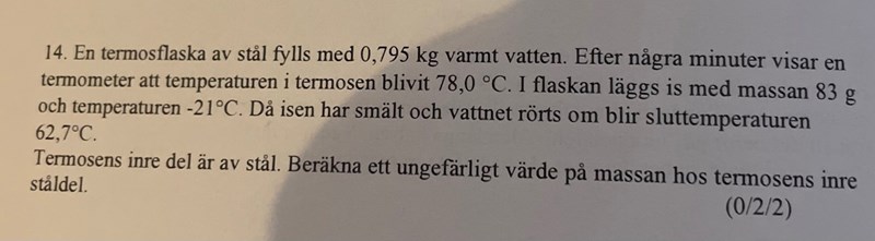 Laguna skrev:Du kan ställa upp det så här: energin för att smälta isen och värma det till 62,7 grader = energin som avges när temperaturen på stålet och vattnet sjunker från 78 till 62,7.