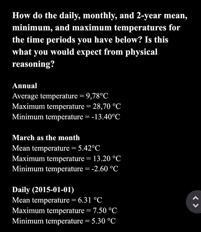 Hej, jag har fastnat lite på en uppgift, speciellt på daily (2015-01-01). Om ni kollar på bilden hur frågan ser ut, jag undrar varför är temperaturen i mean högre i janauri än mars? De frågar efter physical reasoning. Har sökt lite men hittar inte information som hjälper mig. Kan någon hjälpa mig? Tack
