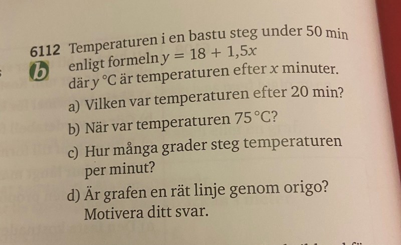 b) vi vet ju att vår funktion beskriver temperaturen i bastun och vi undrar när är den 75 grader dvs vilket ger ekvationen