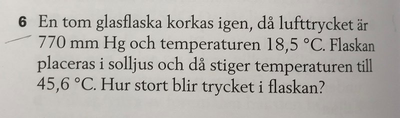 Jag antar att jag ska använda mig av formeln p1•V1/T1= p2•V2/T2 eftersom att det sker en förändring av luftens tillstånd i flaskan som kan antas vara en ”gas”?