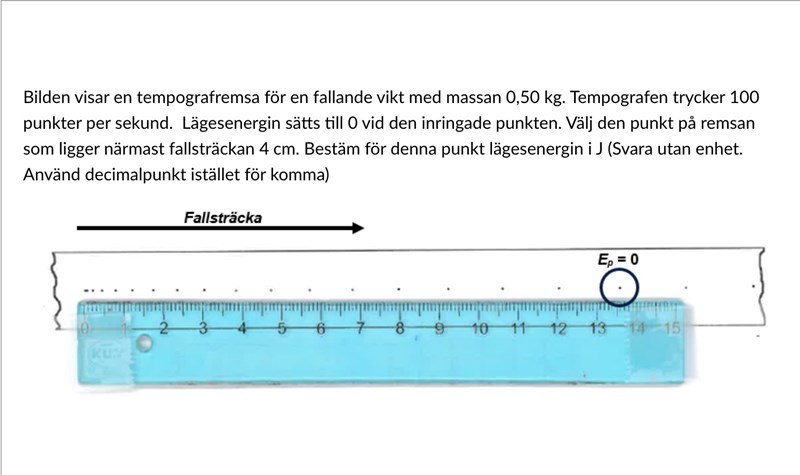 Hur bör man fortsätta med den här uppgiften? Vi vet att massan är 0,50 kg, att tempografen registrerar 100 punkter per sekund och att nollinivån för lägesenergin är vid 13,5 cm när man avläser den på linjalen. Vilket tidsintervall bör man välja för att finna höjdskillnaden? Kan man ta skillnaden mellan punkten som ligger närmast fallsträckan, 4 cm, och subtrahera avståndet till nollnivån på linjalen?