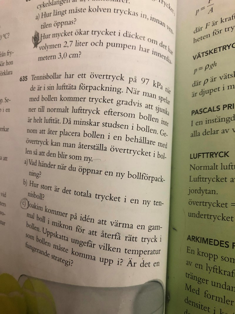 a) Räcker det med att svara att lufttrycket inuti förpackningen kommer att jämnas ut. Dvs att övertrycket kommer att jämnas ut och då kommer trycket ”inuti” förpackningen vara lila stor som utanför förpackningen..